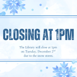 The Beaman Memorial Public Library will close at 4pm on Tuesday, December 2nd due to the snow storm. The Library will reopen at 10am on Wednesday. Stay safe!