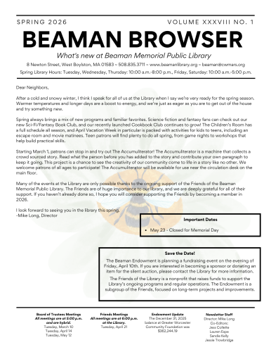 The Beaman Browser is a printed, quarterly newsletter detailing all upcoming programming for children, teens, and adults. It also highlights important upcoming events, changes, etc. happening at the Library. The Beaman Browser is mailed to all West Boylston residents regardless of their library card status. The Browser is also mailed to Friends members who reside in other towns.